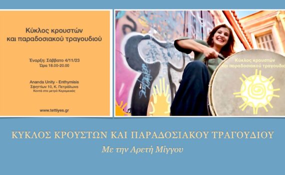 Από το Σάββατο 4 Νοέμβρη στις 18.00-20.00 και κάθε δεύτερο Σάββατο, ξεκινάμε νέο τμήμα:Ανοίγουμε ολοκαίνουργιο Κύκλο κρουστών και παραδοσιακού τραγουδιού στην Αθήνα. Που: Ananda Unity – EnthymisisΣφηττίων 10, Κ. Πετράλωνα, κοντά στο μετρό Κεραμεικός. Συντονισμός: Αρετή Μίγγου www.tettiyes.gr Κόστος: 25€ τον μήνα (20€ άνεργοι, φοιτητές, αμεα)Drop in: 15€ (12€ άνεργοι, φοιτητές, […]
