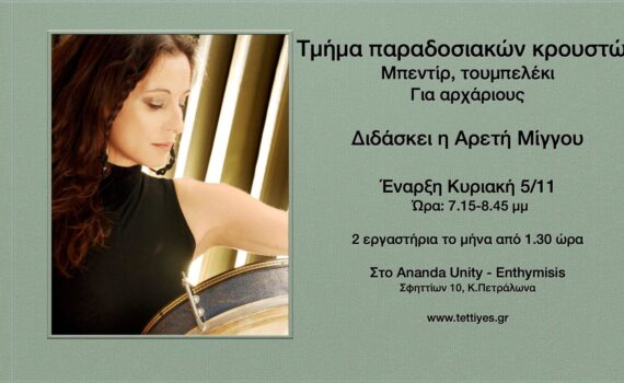 Τμήμα παραδοσιακών κρουστών για αρχάριους ξεκινάει την Κυριακή στις 5 Νοεμβρίου και ώρα 7.15-8.45 μμ. Που: Στο Ananda Unity – EnthymisisΣφηττίων 10, Κ. ΠετράλωναΚοντά στο μετρό Κεραμεικός Διδασκαλία: Αρετή Μίγγου Το μάθημα έχει διάρκεια 1.30 ώρα,είναι 2 Κυριακές το μήνα μέχρι τέλος Ιουνίου.Διδάσκονται τεχνικές για μπεντίρ και “τούρκικο τουμπελέκι”, ρυθμολογία, […]